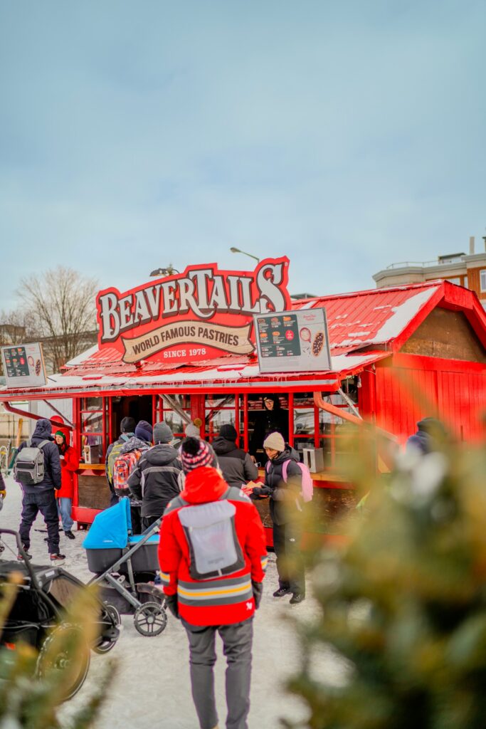 リンク沿いには休憩エリアがいくつもあり、ホットチョコレートやビーバーテイルでひと息つく時間は必須です。
